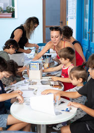 A creative collage workshop for all ages took place in the central square of Sigri. Led by Gunseli Baki, who uses this collage practice extensively in her work, the activity invites children and adults alike to participate. Carte-postales were created in a symbolic gesture of dialogue between the two shores of the Aegean, and a collective collage poster was produced, printed, and left in the village as a commemorative artifact of shared experience.